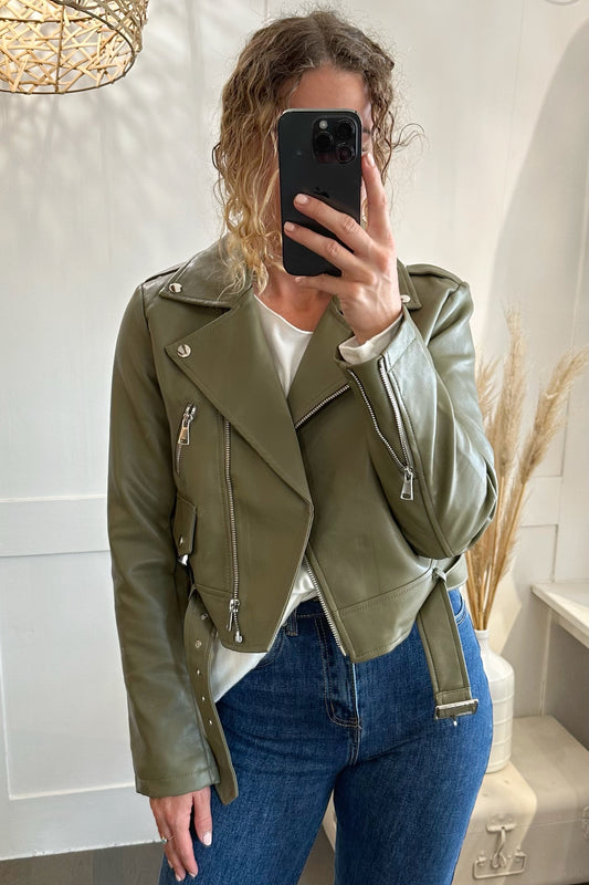 Vegane Lederjacke mit Gürtel in Eukalyptusgrün