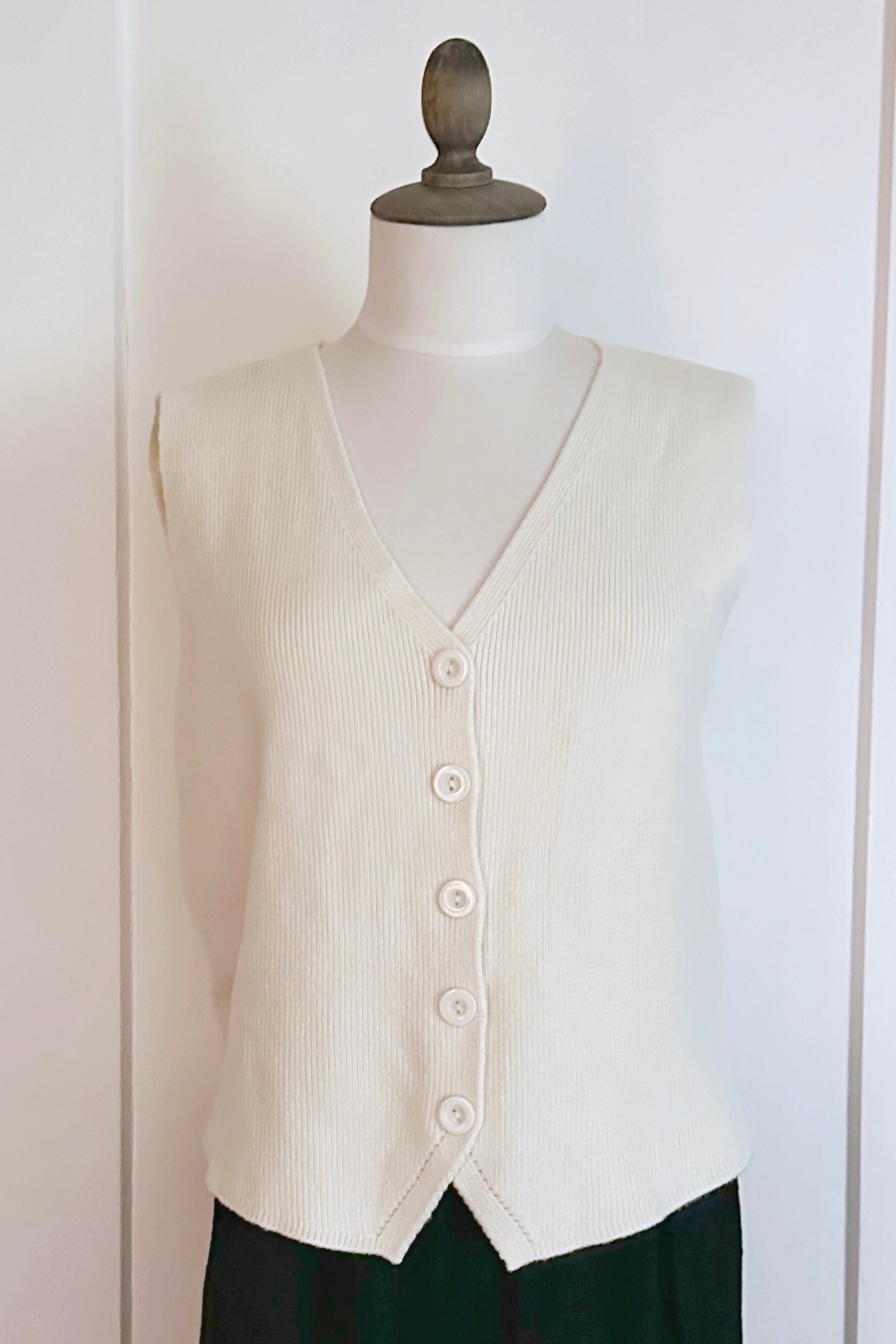 Gestrickte Weste mit grossen Knöpfen kann offen als Weste oder geschlossen als Top getragen werden.