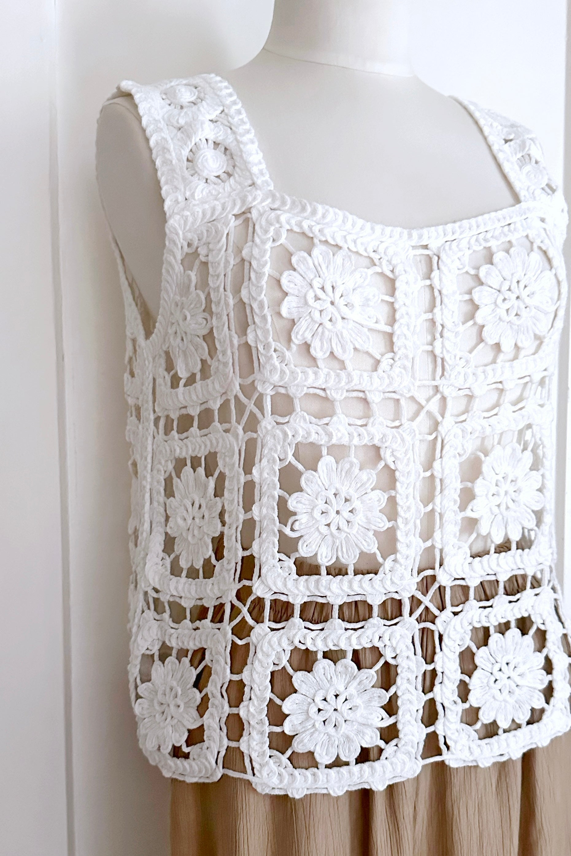 Luftiges Häkel-Top in Schneeweiss mit Blumenmuster. Die Baumwolle sorgt für angenehmen Tragekomfort und Formstabilität. Ideal für warme Tage – solo getragen oder als Layering-Piece. Onesize (passt XS–L), maschinenwaschbar bei 30 °C.
