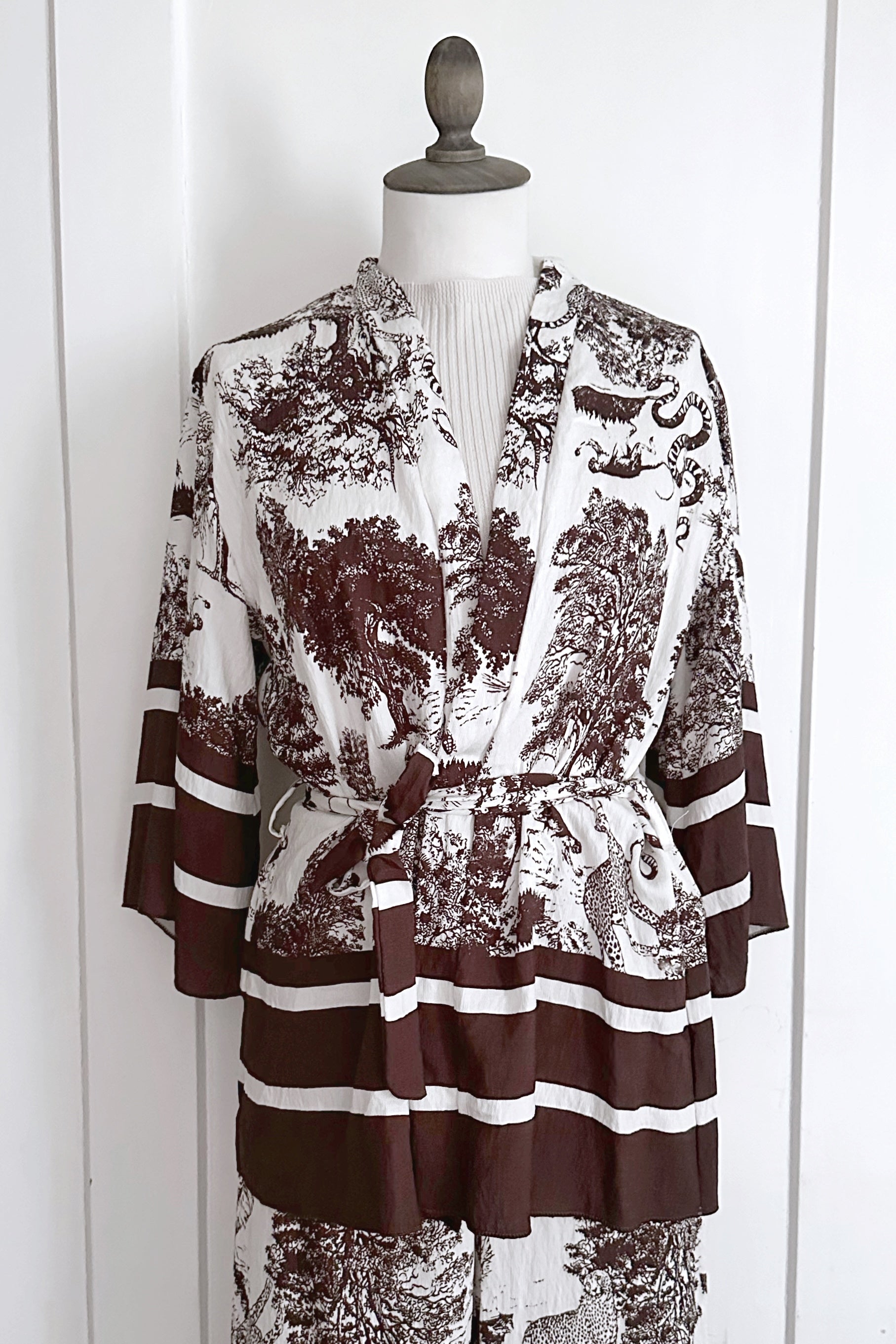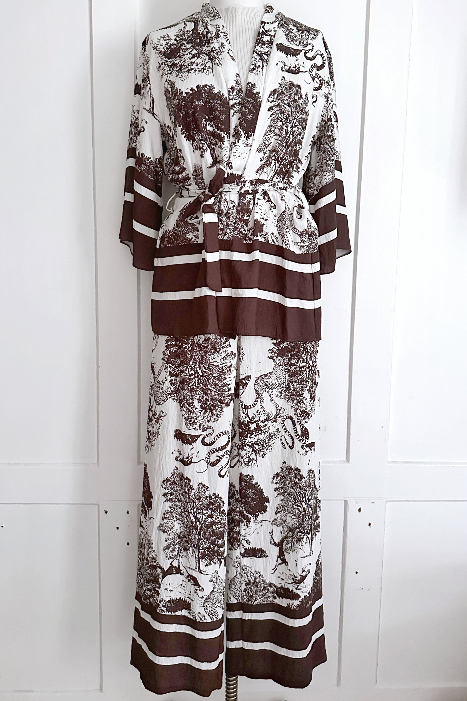 Luftiger Kimono mit wunderschönem Djungleprint aus Viskose, mit dazu passender Hose. Einheitsgrösse zum Binden (XS-L). Maschinenwaschbar bei 30•.